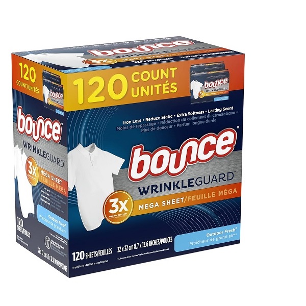 Bounce WrinkleGuard Mega Dryer Sheets, Fabric Softener and Wrinkle Releaser Sheets, Outdoor Fresh Scent, 120 Count (Pack of 2, 60 Count Each)